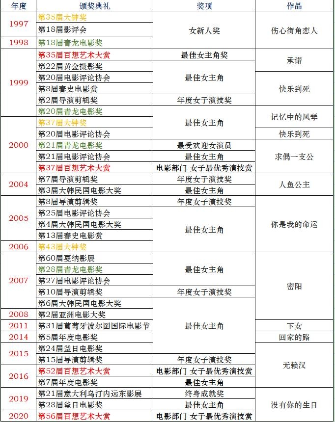 我们从罗列的数据可以发现,全度妍一共拿过四届百想艺术大奖的影后,两届青龙电影奖影后,两届大钟奖影后,一届戛纳影后,自1997年开始出演电影以来刷奖无数,电影处女作《伤心街角恋人》就荣获第35届大钟奖、第18届青龙电影奖女新人奖,这实力属实牛逼。