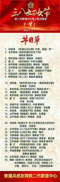 多才多艺铁二代,载歌载舞迎三八。晚会期间,由铁二代联谊中心主任罗一创作并朗诵的诗朗诵《铁道女兵礼赞》首先登场响亮,拉开了晚会的序幕。紧接着,由曹绥林演唱的歌曲《我的祝福你听见了吗》;由牟建京演唱的歌曲《绒花》;由孙建敏创作的散文《我的妈妈》;由陈朝凯演唱的歌曲《相逢是首歌》;由沈丽演唱的歌曲《红太阳照边疆》;由严越培演奏、拍摄并制作的短片《红梅赞》;由王军演唱的京剧选段《梨花颂》;由董建国演奏的钢琴独奏《女人花》;由仇彦玲朗诵的诗朗诵《我的思念如大海——献给母亲的歌》;由张中一演唱的歌曲《拉住妈妈的手》;由彭丽昆朗诵的诗朗诵《春夜喜雨》;由易明演唱的歌曲《家乡的月亮》;由张玉梅创作的散文《妈妈有一双能干的巧手》;由蔡翠松创作的绘画《迎接春天》。