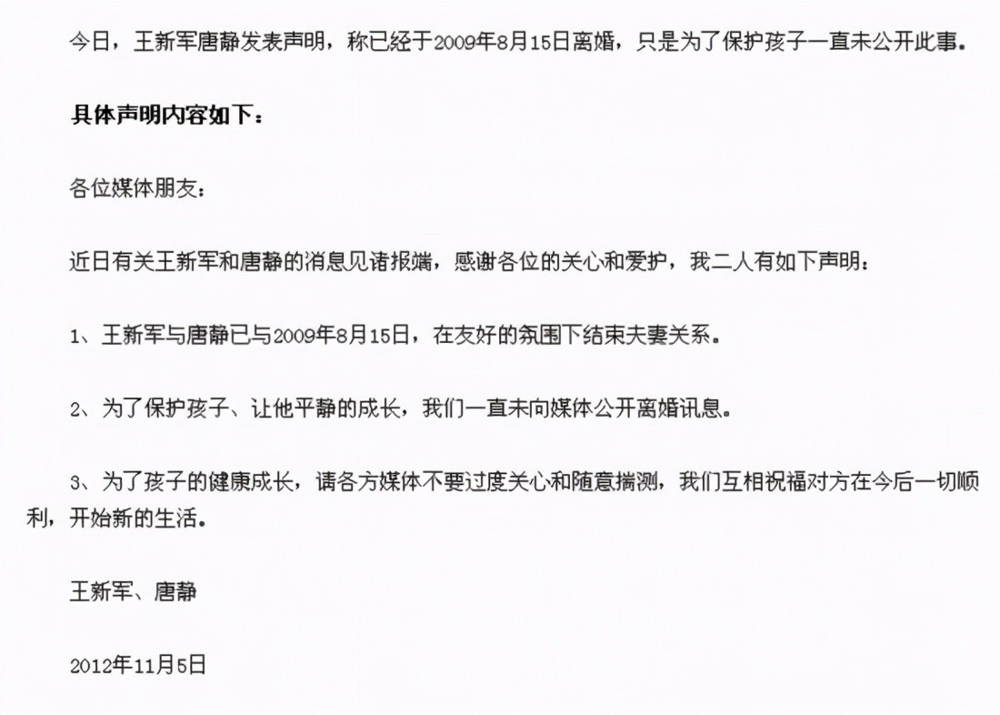 直到王新军和前妻唐静公开声明,证实双方已经在2009年离婚,只是为了孩子没有将离婚的事情公布,这才让秦海璐远离了流言蜚语。