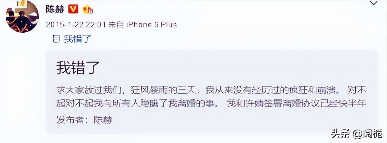 流言出来三天后,陈赫发布长文《我错了》,文中有眼泪,也阐述了流言对自己的伤害。