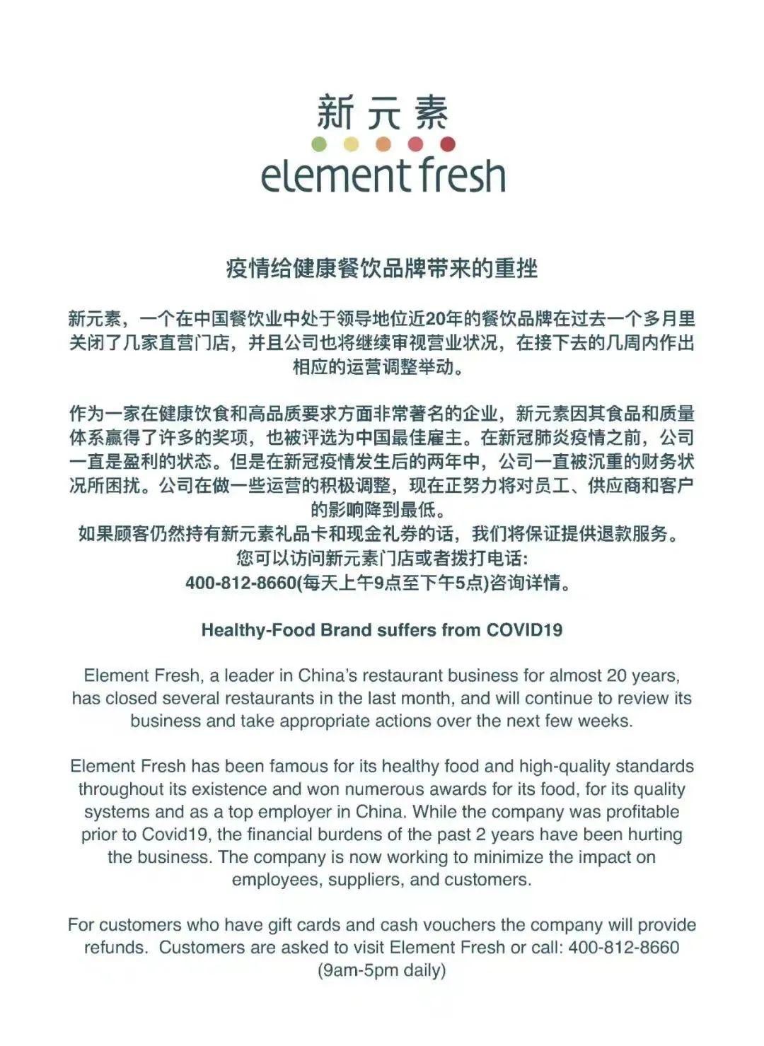 对此,新元素官方微信在2021年12月20日发布了给粉丝的信表示,受到疫情的严重影响,“新元素,一个在中国餐饮业中处于领导地位近20年的餐饮品牌在过去一个多月里关闭了几家直营店......”