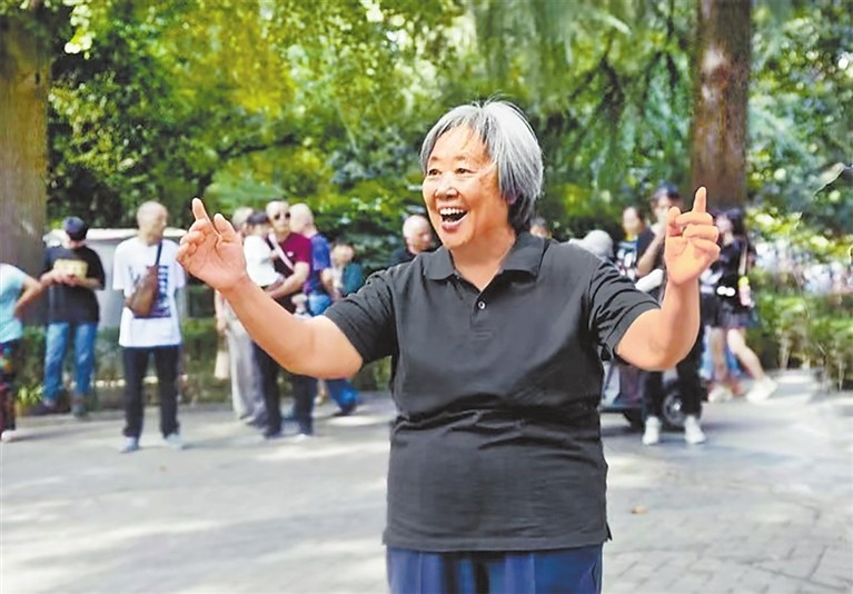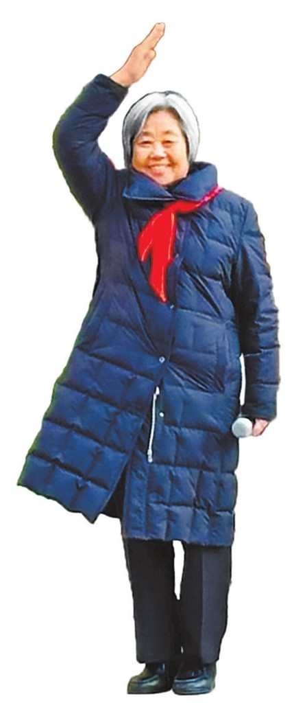 熙攘的人群中,一眼就看到了满头白发、戴着鲜艳红围巾的周慧玲。她手拿话筒,一会儿招呼大家来扭秧歌,一会走下台阶去摆放凳子,不停穿梭、大声指挥。不时有走过来的邻里,拉着她的手唠上几句,热情地抱一抱。
