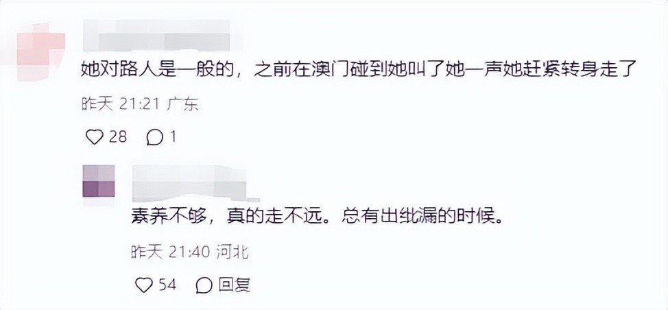 还有其他网友说,之前在澳门见她也是这样,感觉她对路人的态度很一般,看来明星的素养要是不够,走也走不长远,难怪被封杀了。