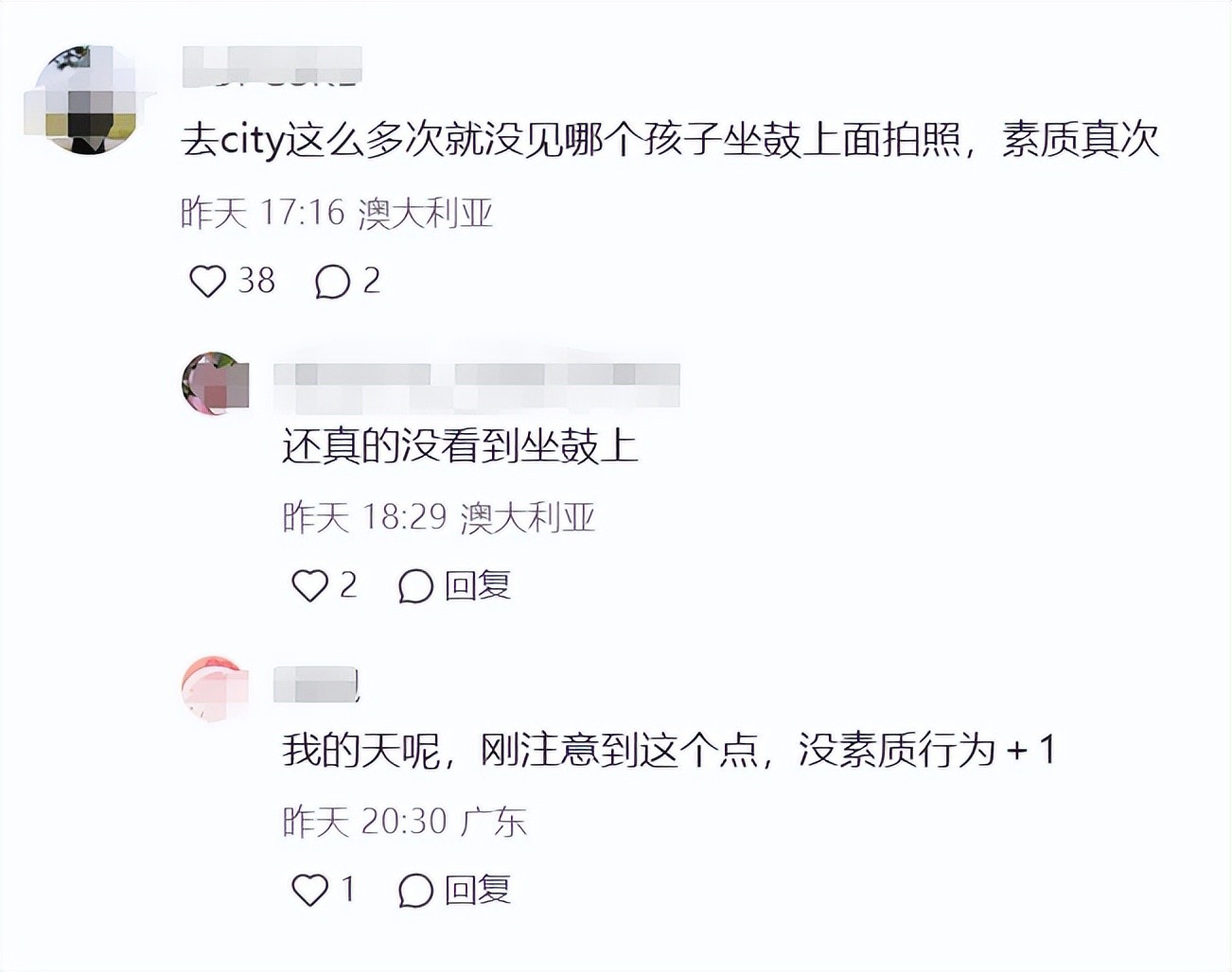 一个是张嘉倪让孩子坐在市政厅士兵雕塑的鼓上面玩,网友说去了那么多次,都没见过谁让自家小孩坐鼓上面拍照的,素质真差。