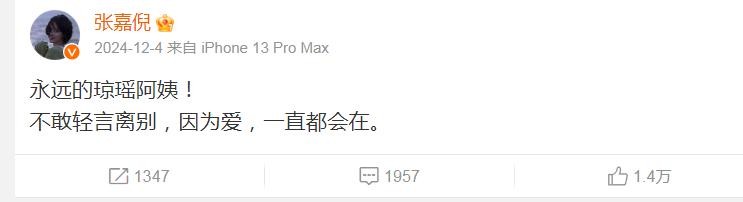 不过前段时间,琼瑶去世的消息传来,张嘉倪还是发了一条缅怀琼瑶的动态,这也是她这一年多来唯一一次发别的类型的文。