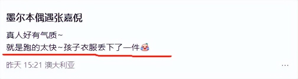 另外就是张嘉倪发现自己被路人认出来后,就匆忙带着孩子走了,甚至可以说是“跑了”,不但没跟热情的网友打个招呼,而且慌乱到把孩子的棉马甲丢下,都没带走。