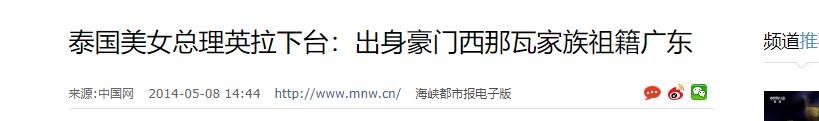 信息来源:《泰国美女总理英拉下台:出身豪门西那瓦家族祖籍广东》,中国网,2014年5月。
