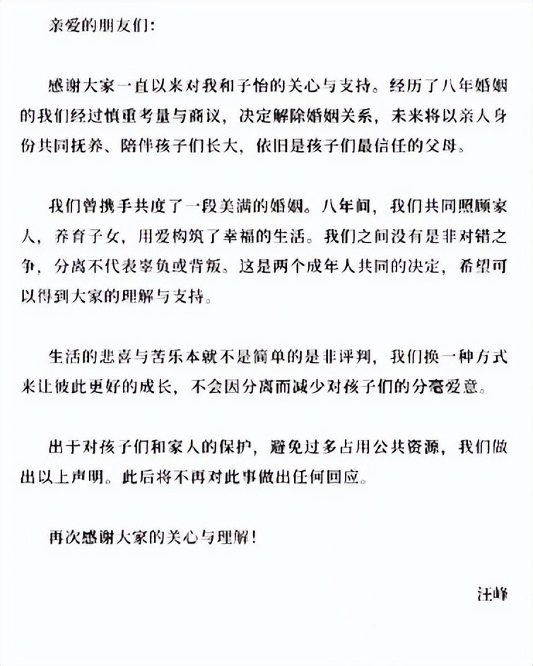他们在离婚声明里写得清清楚楚:我们曾经很幸福,没有谁对谁错,以后各自安好。