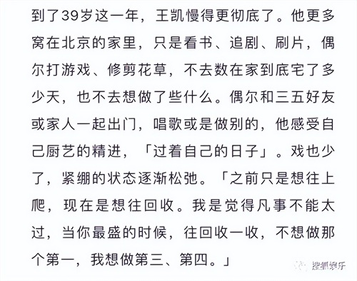 可谁也没想到,正处事业上升期的王凯,会在几年后放慢脚步,不再执着于梦寐以求的“一线明星”位置。