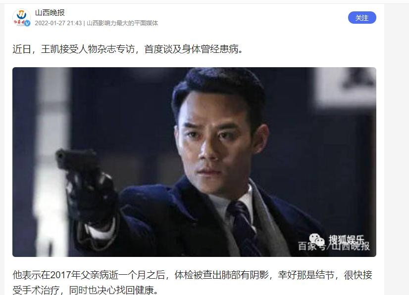 【3】山西晚报,2022-02-27,“王凯首谈身体患病 曾被查出肺部有阴影”.
