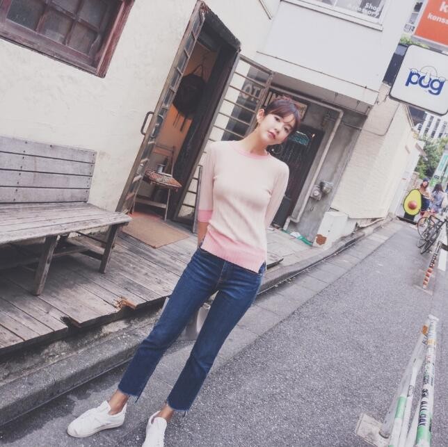 图为张子萱街拍照,针织衫配仔裤,这身材真是太苗条了,丝毫没有受到怀孕生娃的影响呀。 (来自:七日娱乐)
