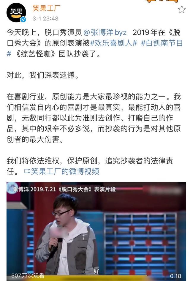 随后,笑果工厂官方发文直指白凯南抄袭,还做出二人表演片段对比视频,表示在喜剧行业,原创是基本,抄袭是对他人的伤害,将依法维权。