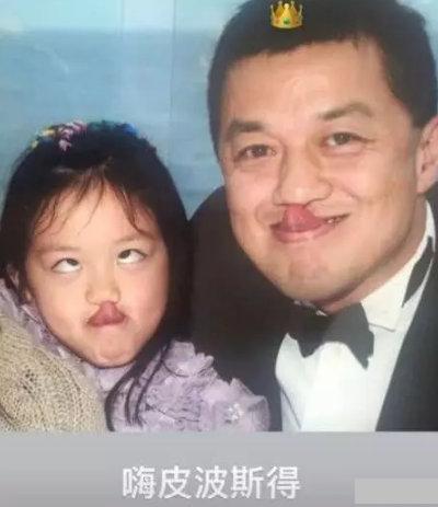 照片中的父女俩头抵头,笑嘻嘻,李嫣做着斗鸡眼,伸出上唇遮住人中,满脸的鬼马精灵。媒体戏称这是一张“遮唇照”。