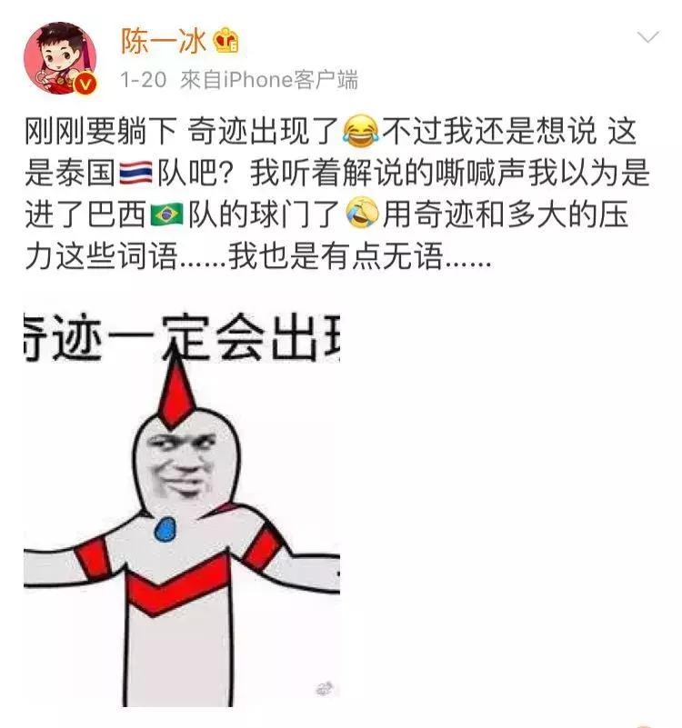 1月20日晚,中国男足在2019年亚洲杯八分之一决赛中2-1逆转泰国。当国足0:1落后泰国时,前奥运吊环冠军陈一冰发微博说,“如果连泰国都能输,我觉得其实里皮的年薪我也可以拿的,反正我执教的话最多再多输几个球而已,结果都一样嘛。”