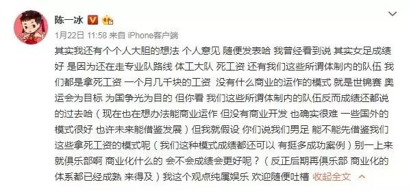 这番言论在网上争议不少。当然,球迷之间发表各种看法也很常见,关键是陈一冰随后抛出了一个让人诧异的观点——女足成绩好是因为还在走体工队模式,像他之前所在的体操队一样,都是“体制内”的队伍,每个月都拿几千块的死工资,没有商业运作。而这些队伍反而成绩都还“说得过去”,因此,他建议男足也借鉴这种模式,别搞商业化了。