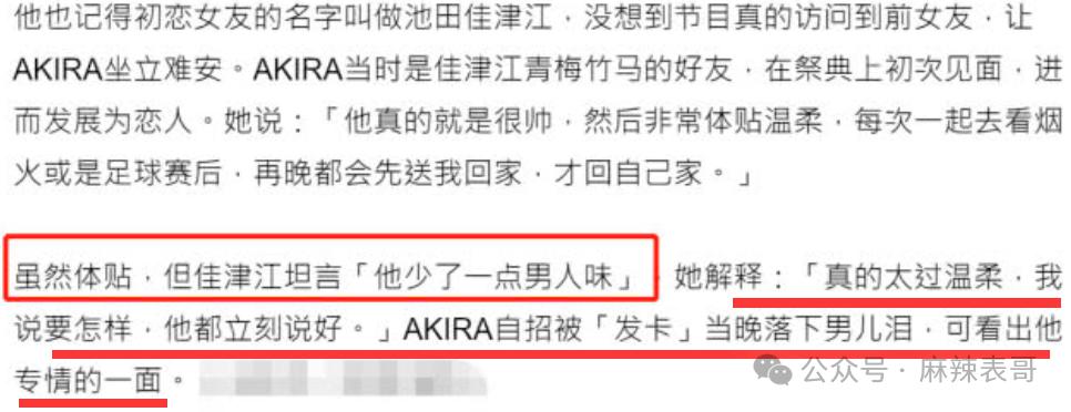 以前,就有节目找到黑泽良平高中时候的初恋女友,问高中时为啥把他甩了,初恋女友说,因为嫌弃他性格太温柔,自己说什么他都言听计从。