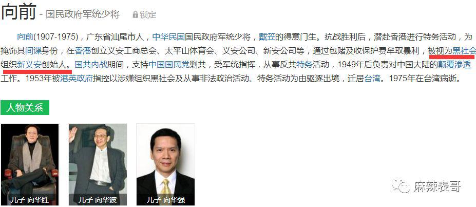 向华强的老爹向前(嗯,向佐的弟弟叫向佑,就是这么随意),就是"新义安"(香港著名的国际性黑社会组织,香港经济实力最强、组织最为严密的三合会组织)的创始人。