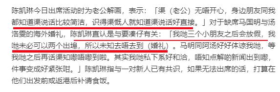 马明马上要办婚礼,周边人尤其是关系亲密的朋友出席公开活动都会被港媒循例问话,诸如参不参加婚礼,有没有恭喜他之类。