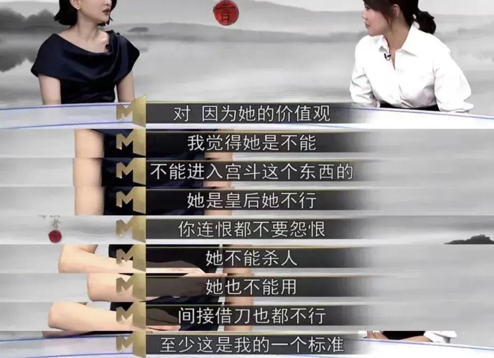 "我觉得她是不能进入宫斗这个东西的。她是皇后她不行,你连恨都不要怨恨,她不能杀人,她也不能用间接借刀(杀人)也不行。至少这是我的一个标准,你除非让我演一个坏人。"