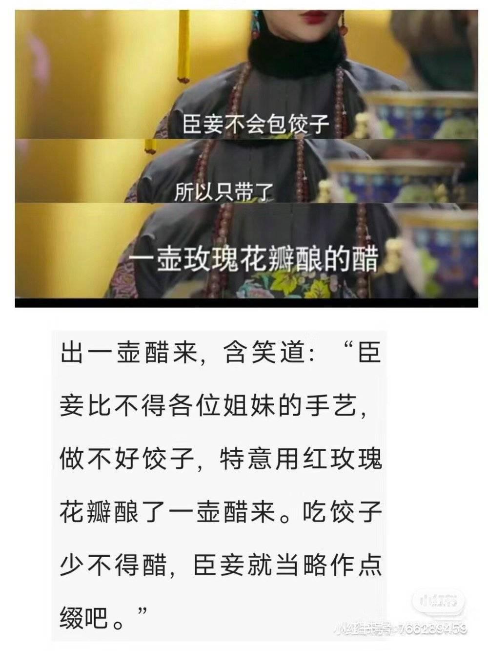 比如在原著中,乾隆举办家宴,人人都带了饺子,唯独如懿带了一壶醋,原著中如懿用一大段高情商对白自谦没有其他嫔妃的好手艺,在周迅的改动下,变成了一句"臣妾不会包饺子,所以只带了一壶醋"。