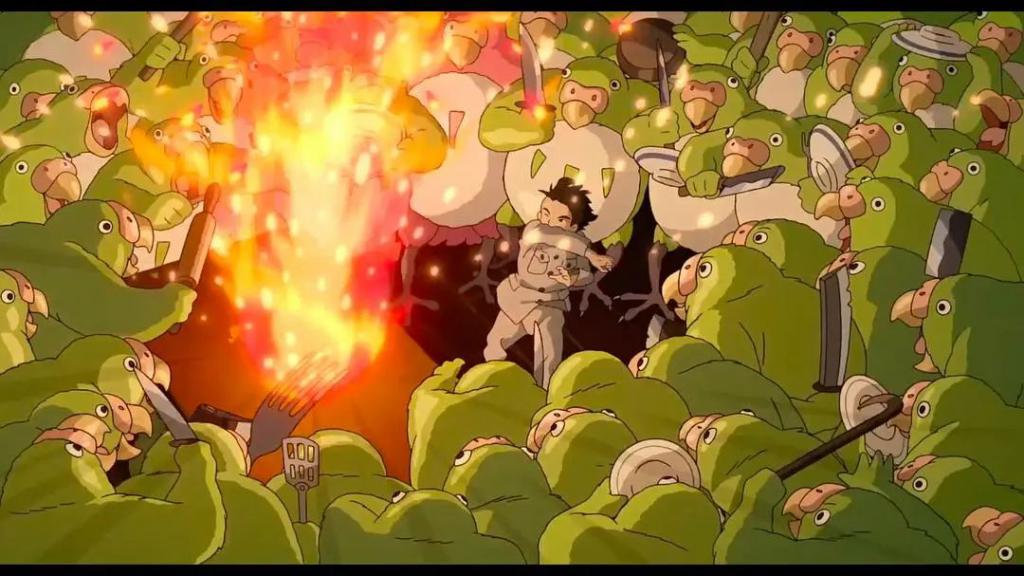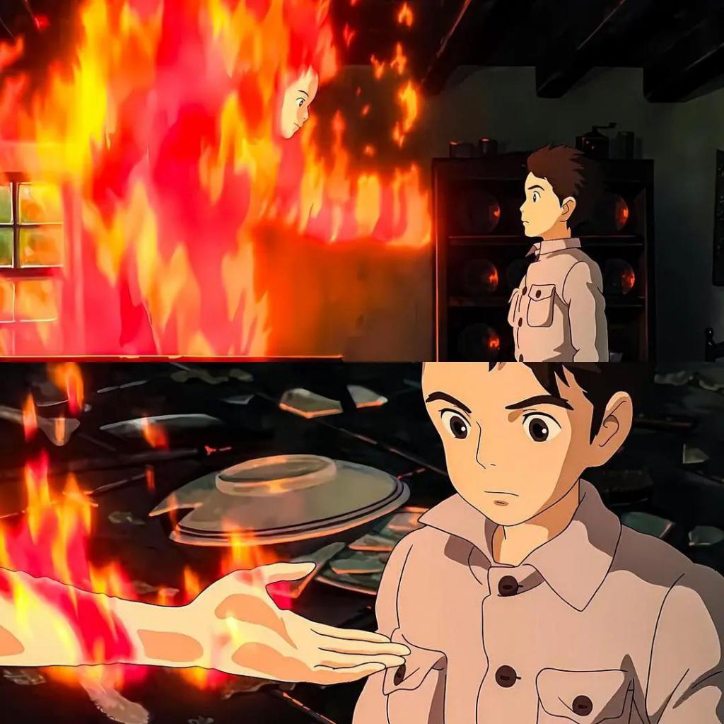 开头对于火灾的表现,是宫崎骏延用了已逝好友高畑勋的技艺(也可理解为纪念),将手绘的温度保留至最纯粹的形态。