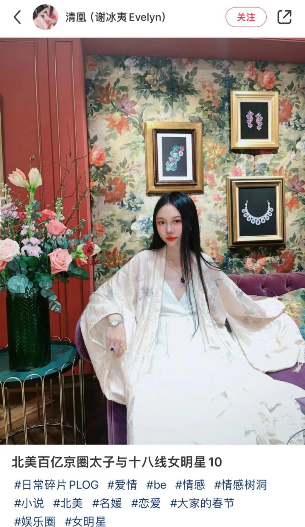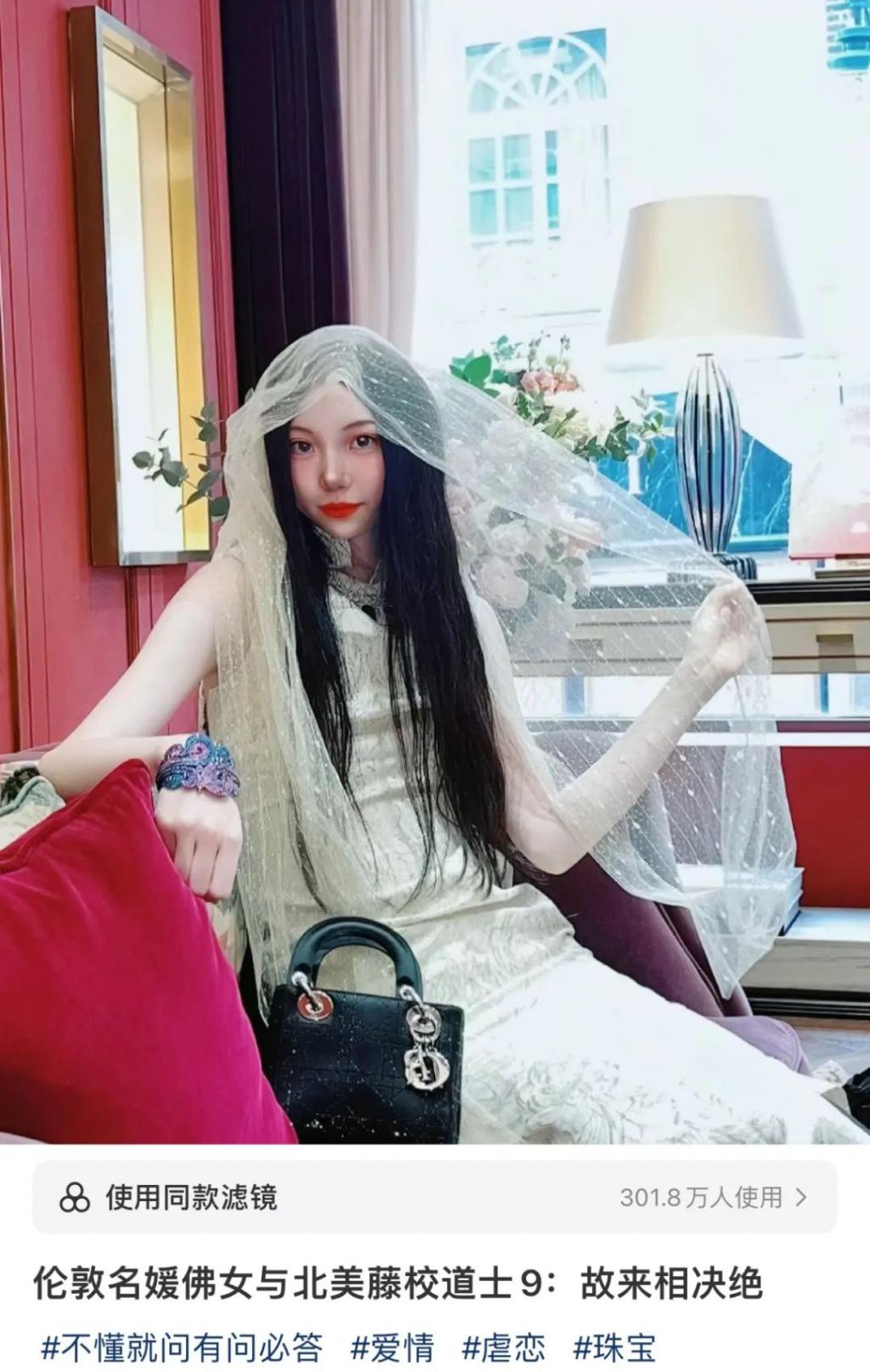小红书里的她,穿一身古风衣服,腕戴 DIOR 玫瑰系列高珠腕表,脖挂冰种翡翠项链,拎泛着蓝色光芒的鳄鱼皮戴妃包,端坐在 VIP 室内,看画师一笔笔描摹自己,宛如郎世宁给甄嬛画仕女图。