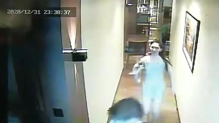 二人在拥吻了几分钟后便各自回到房间休息了,但是事情并没有因此结束,到了凌晨四点时监控画面中又出现了白帽男子的身影,而且他的一系列行为非常奇怪,他在两个房间不停地来回穿梭,直到四点三十分时诡异的一幕出现了,只见克里斯汀被一名陌生男子抱着从2207房间走出,而当时的克里斯汀四肢无力的下垂着,头也是无力的搭拉在一旁。