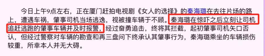 2006年,在开车去拍摄《女人的选择》时发生车祸,秦海璐受惊吓之余也不忘提醒司机开车去追肇事者。