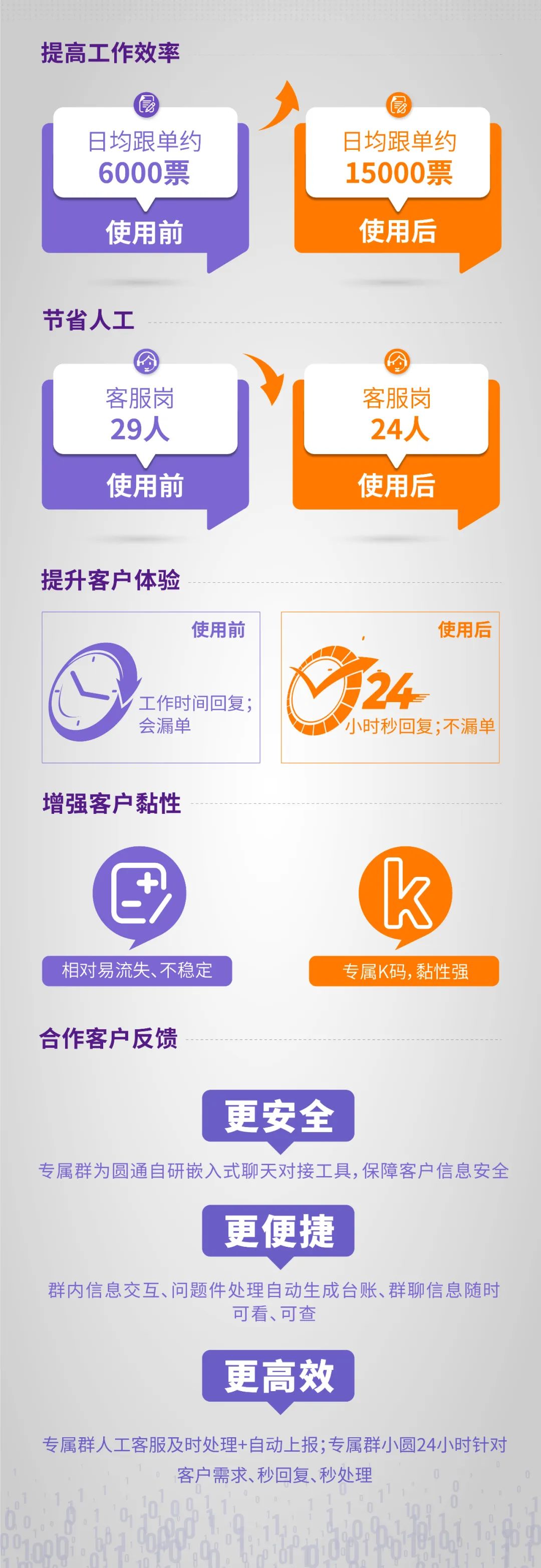 作为分公司数字标准化项目的核心系统之一,智能客户服务系统(即圆钉独家客户群)是圆通整体建设综合客户服务系统的重要组成部分,自推出以来,它已成为圆通与客户保持高效沟通、快速解决问题的稳定桥梁。使用后,圆通服务客户的能力显著提高,客户体验显著提高。