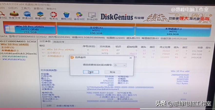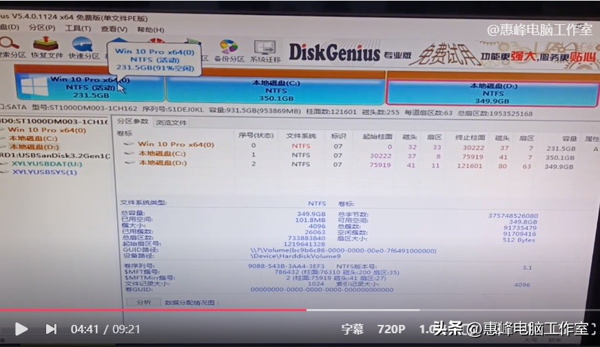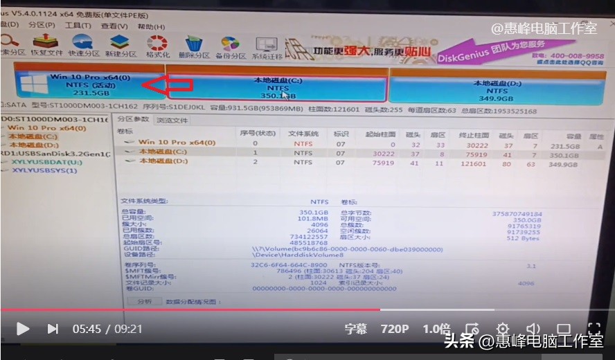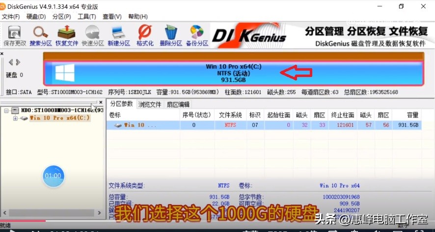 进入PE系统,打开软件,当前测试的是一块1000G的硬盘,里面有一个区,并且已经安装了操作系统,以及一些常用 软件。