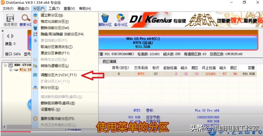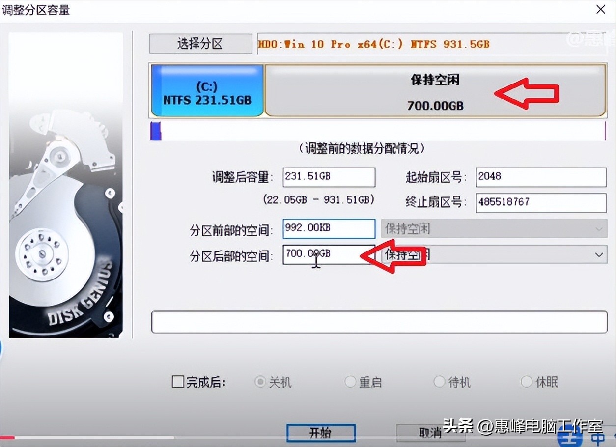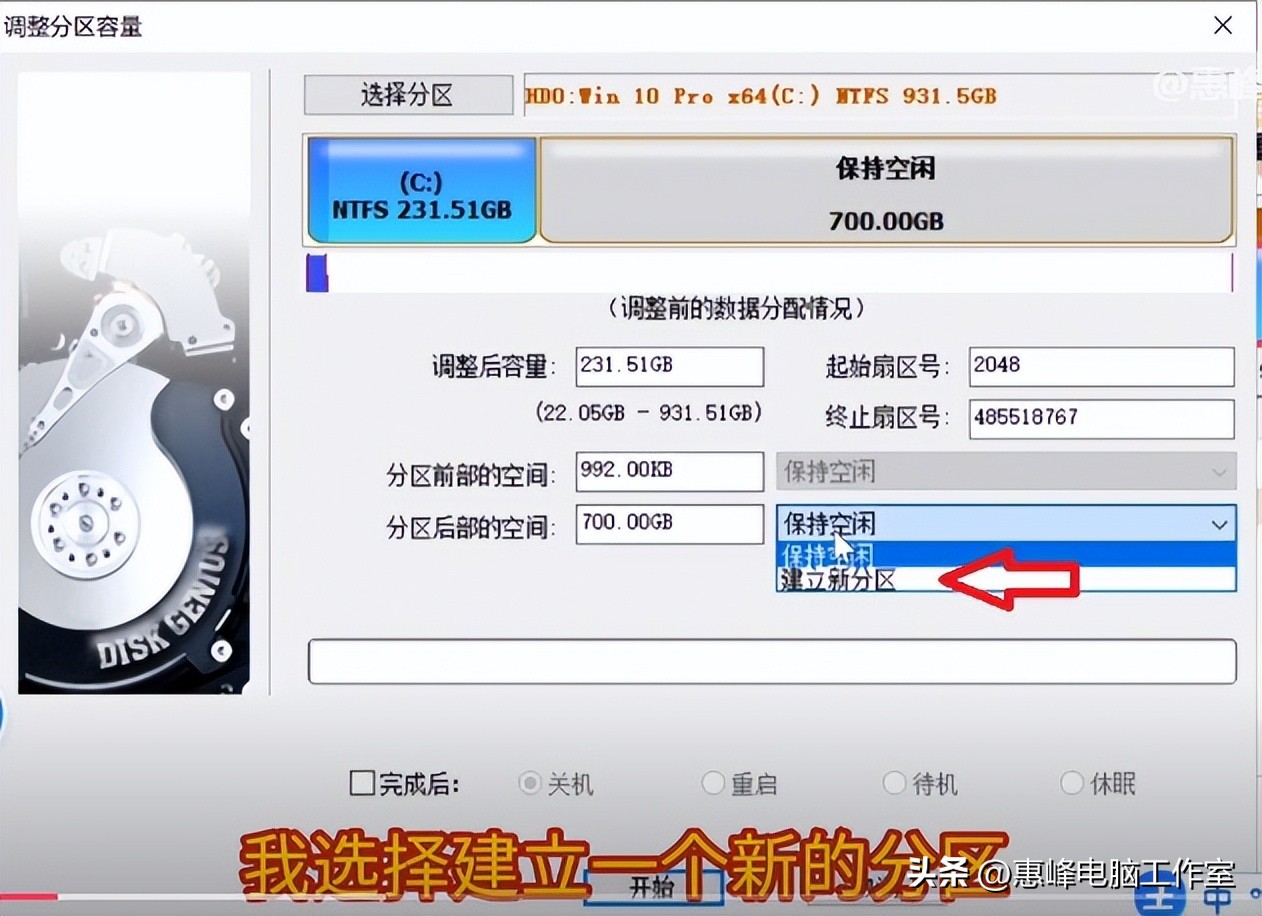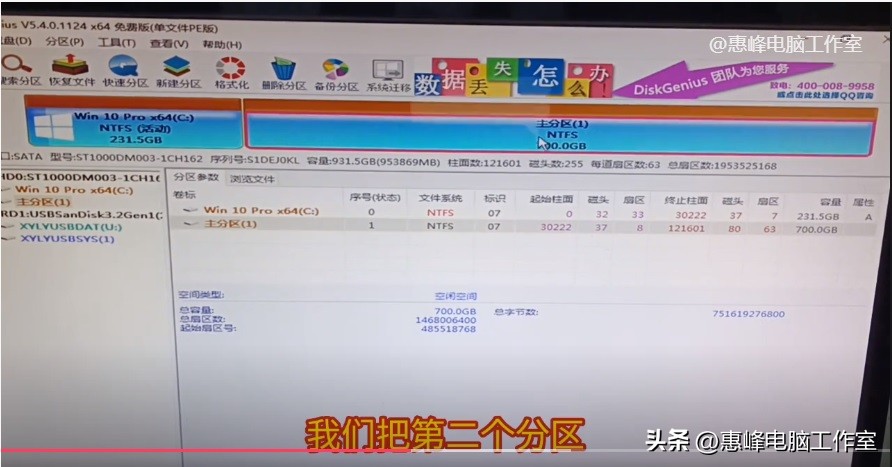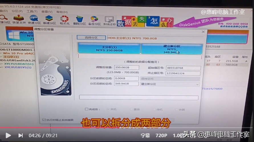 还可以把700G的新分出来的分区,拆分成二个分区。选择分区菜单,拆分分区,可以设置拆分的二个分区的大小,设置完成后,选择确定,开始拆分。