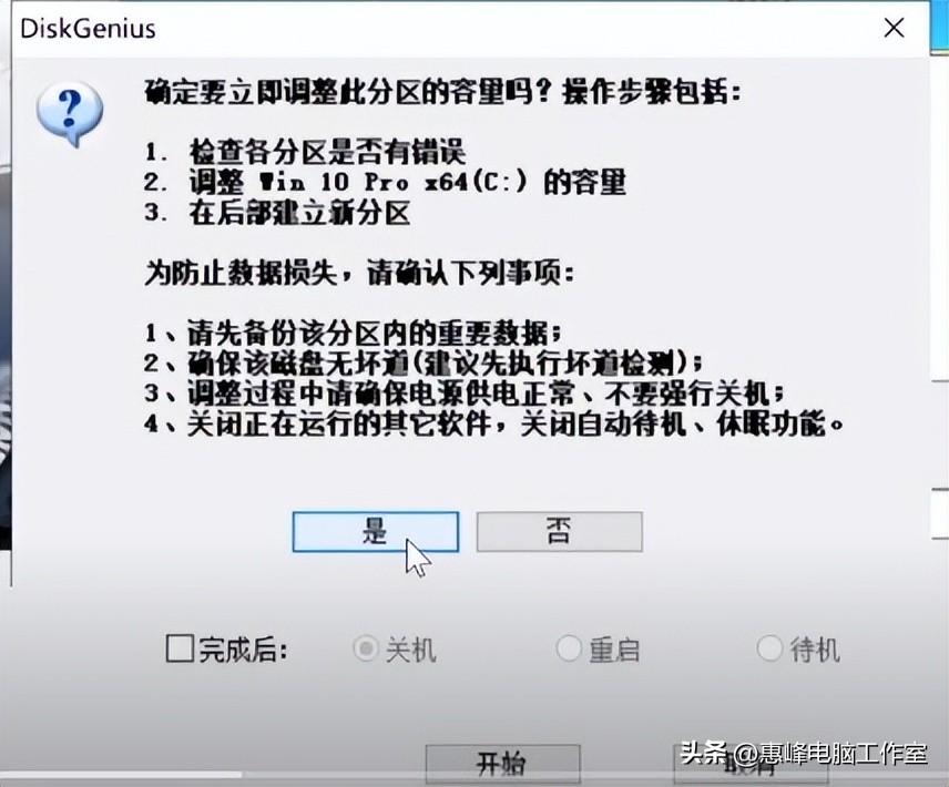 选择开始,提示建立新分区有一定的风险,数据可能丢失。选择 是。