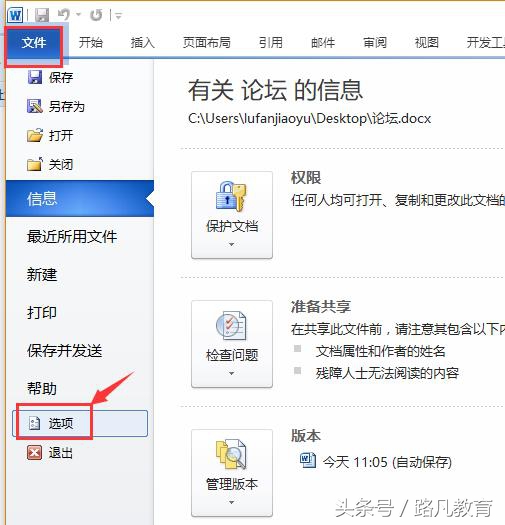 单击word左上角的【文件】,然后找到最后一行的【选项】。如下图: