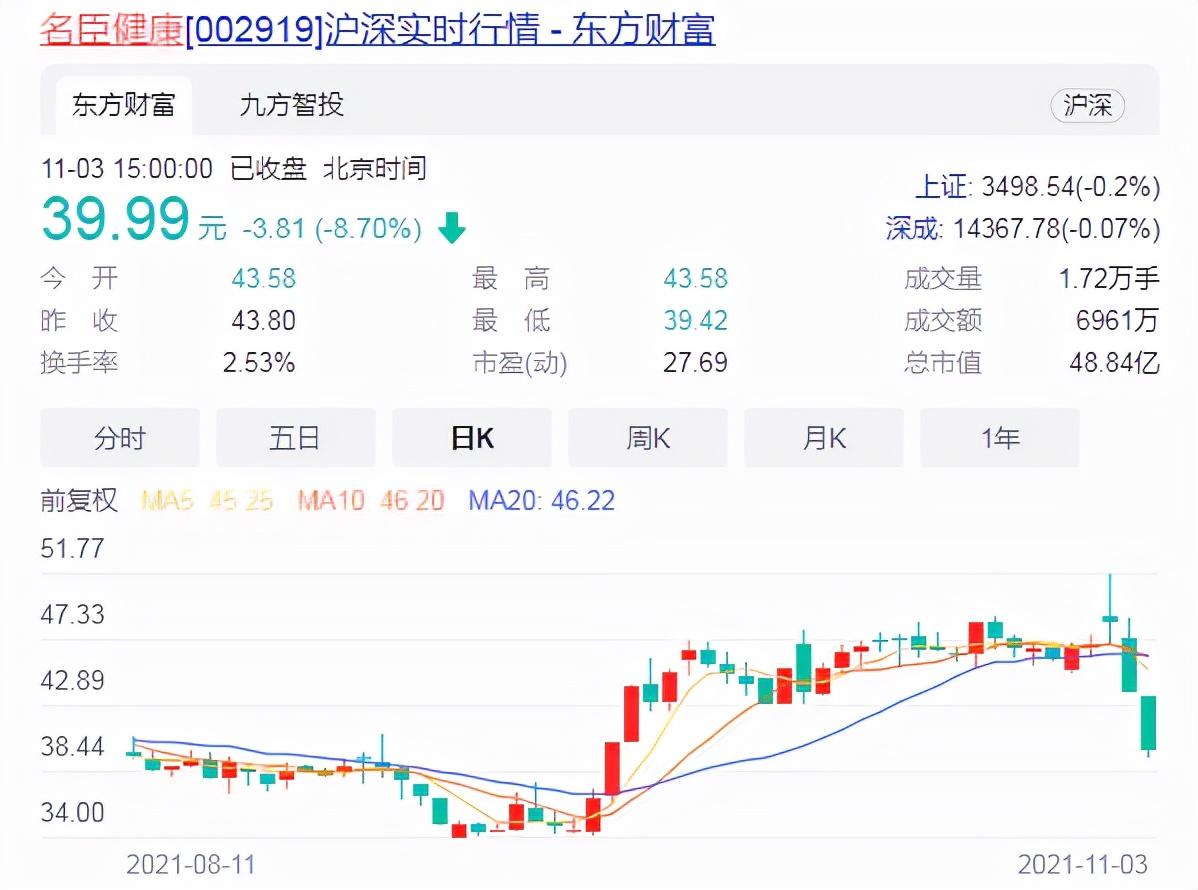 11月2日,名臣健康几乎跌停,收跌9.8%,报43.8元/股。今天,名臣健康在开盘时继续迅速下跌,随后略有回升,但下午严重下跌。最终收跌8.7%,报39.99元,最新市值48.84亿元。