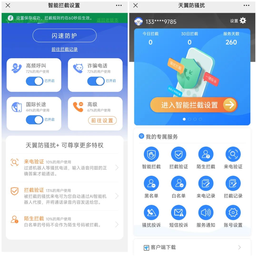 除了拦截境外来电,“天翼防骚扰”微信公众号还可以用于拦截高频呼叫、营销来电、诈骗电话以及指定号段。内置的容忍度设置可自主选择对其它用户标记/投诉/举报次数为10次以上/15次以上/20次以上的号码进行智能拦截,还有防护时段设置,对骚扰来电可设置为全天拒接;或者按时段拒接,时段可进行自定义修改。