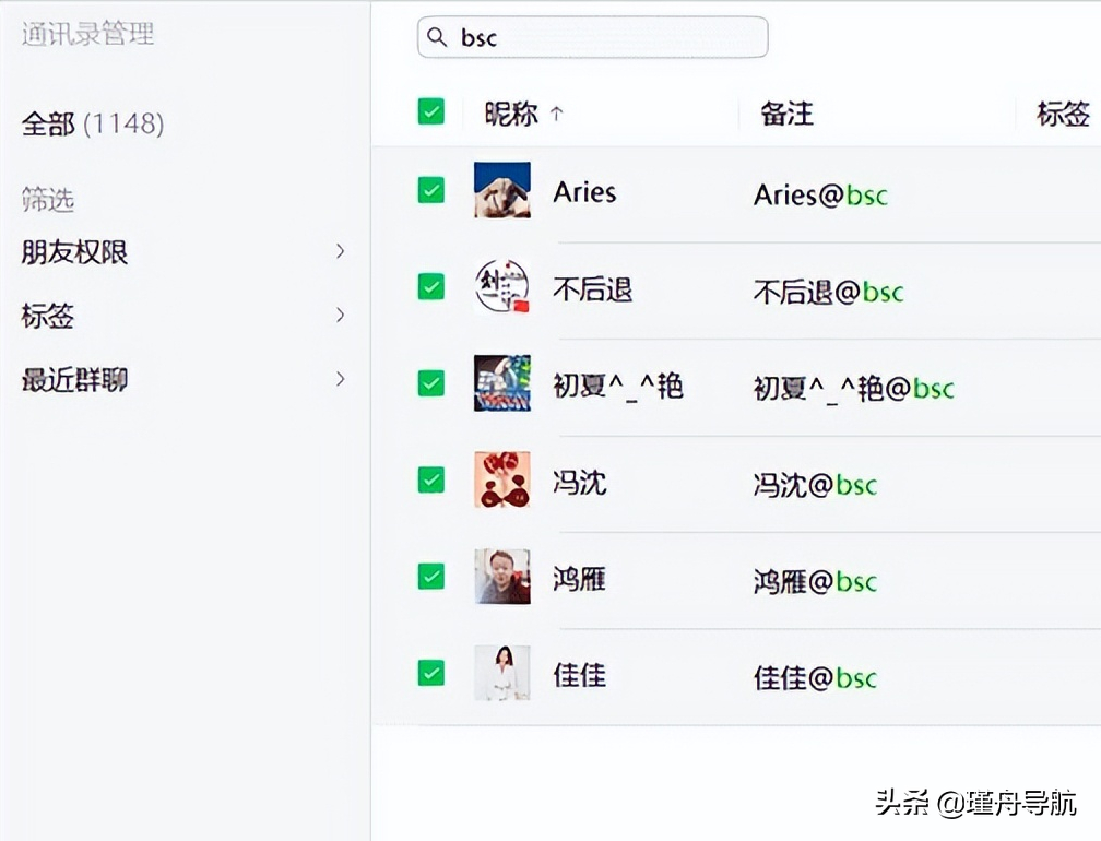 在这之后,你再通过打开 PC 版微信的「通讯录管理」功能,搜索 “bsc” 或搜索 “blh”,即可对这些异常好友进行