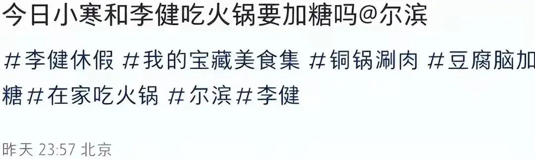 王迈在分享的动态中,还玩起了最近在哈尔滨非常流行的“加糖”梗:“今日和李健吃火锅,要加糖吗尔滨?”