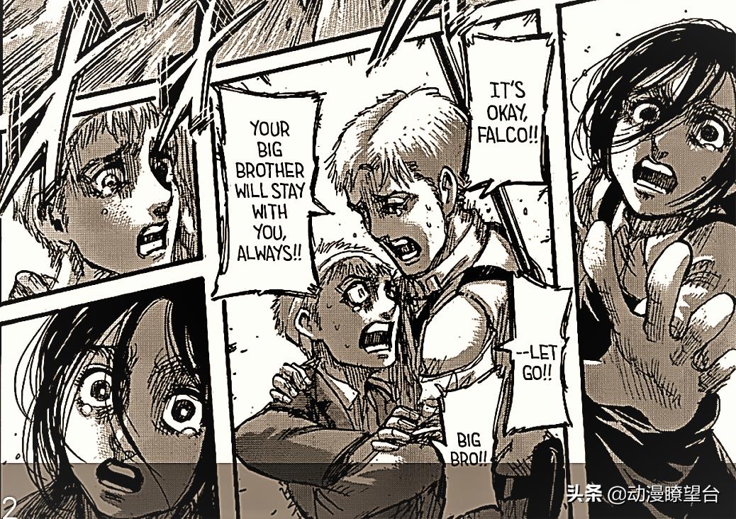 而为了自己坚持的理想,吉克没有丝毫的犹豫也没有余力去思考。于是嚎叫之力发动,法尔克变为巨人,而最后一刻都紧抱着弟弟的柯尔特则被巨人化时的蒸汽烧死,只留下在一旁露出绝望表情贾碧。其他的喝过特制红酒的墙内的高层们也在一瞬间变为了巨人。