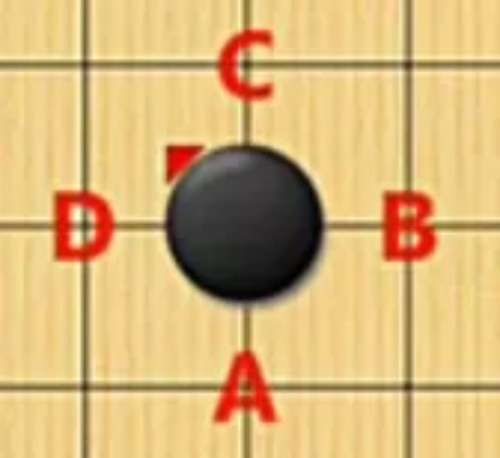 围棋不同于五子棋,它只有横竖线,没有斜线概念,每一个子的上下左右各有 4 个「气」。