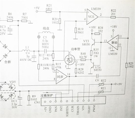 这样属于间歇性加热、停止加热时不报警故障代码,加热时功率较高,电磁炉工作在高功率、零功率两状态表现。电磁炉的功率主要由功率管G极脉冲宽度决定,来自LM339的13脚,受控于11脚PWM功率控制与10脚振荡锯齿波电压高底比较的结果,而LM339的11脚电压受控于2脚VCE即功率管C极过压保护、CN3插头PWM功率控制信号两因素。