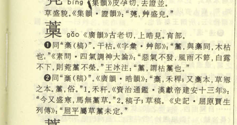 根据《古代汉语词典》,“藁”有两个兄弟,一个是“槀”(上高下木),如今变上下结构为左右结构,写作枯槁的“槁”;一个是“稾”(上高下禾),同样是上下变左右,写作稿件的“稿”。由此,我们便能知道“藁”字曾经也“富”过,有过多种含义:一个指枯槁,一个指禾杆,如“今又盛寒,马无藁草。”(《资治通鉴》),还有一个是指书写的稿件,如《史记·屈原贾生列传》便说屈原写了“草藁”(草稿)。