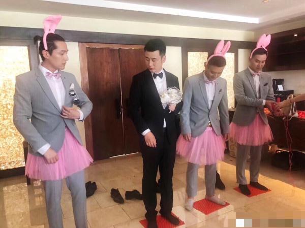 还有一张比较搞笑,胡歌与其他两位伴郎还有新郎一起脱了鞋子站在垫子上,但是伴郎却带着粉红兔耳朵,胡歌也是不列外。另外还搭配一条粉色半裙,看到这样的胡歌简直就雷到了,好好的一个男神咋就边样了,你说扎个小编也就算了,咋滴就扮上了兔女郎了。所以,结婚不易,做伴郎也是不易。