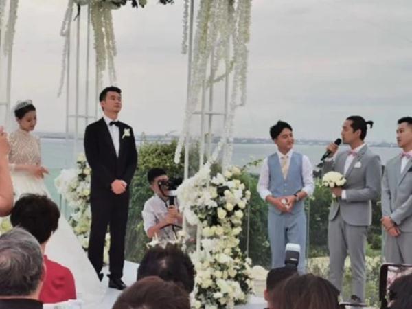 从照片上看,当日胡歌与其他两位伴郎一样,穿着一身灰色的西装,简洁大方还多了份儒雅,同时也正好跟穿黑色西装的新男区分开。领口的粉色蝴蝶结很抢眼,不过几个伴郎都戴上了蝴蝶结,所以这也没什么突兀的。