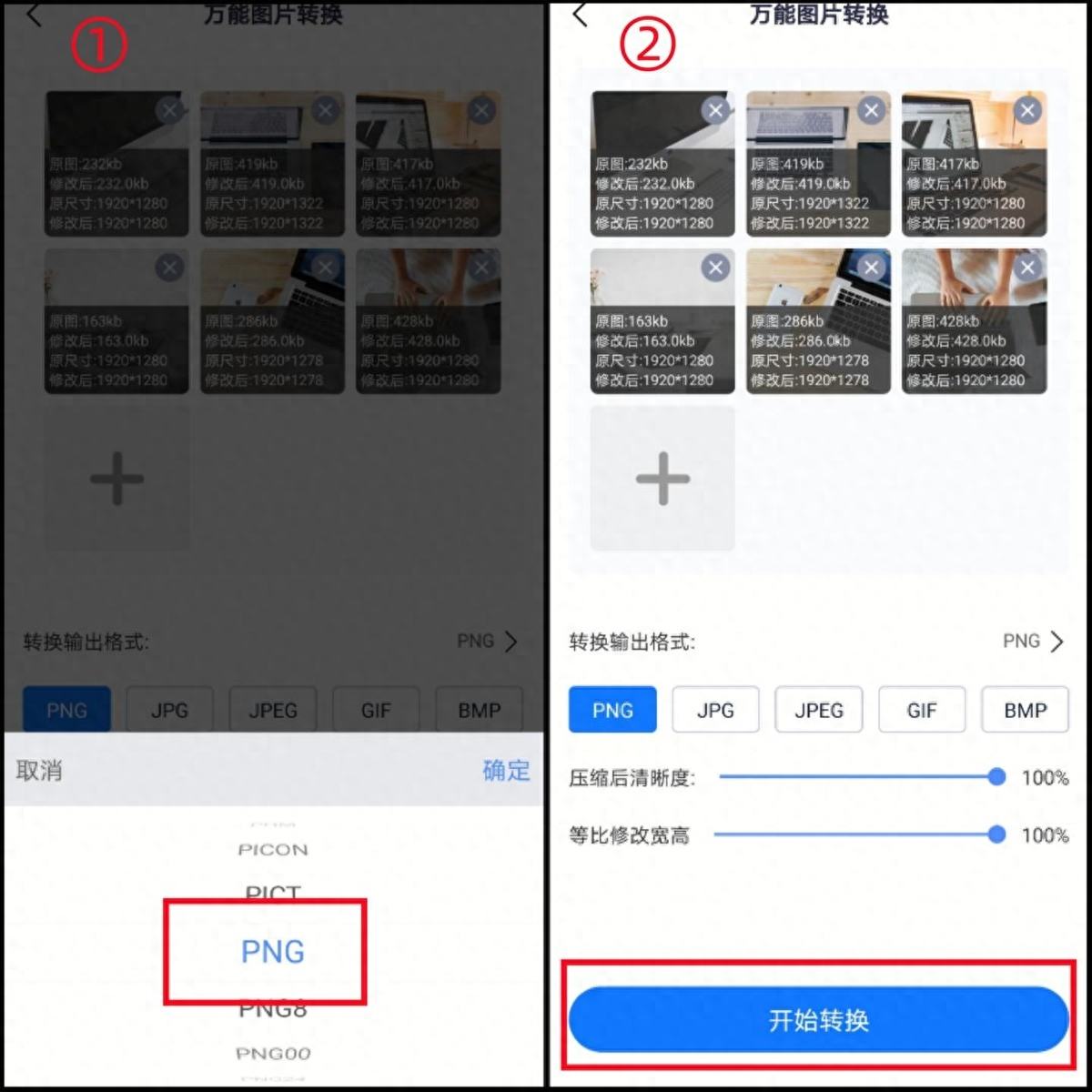 ② 进来后把照片的转换格式选择PNG格式,点击【开始转换】,照片的格式就会转换成PNG格式并保存到相册中去啦。