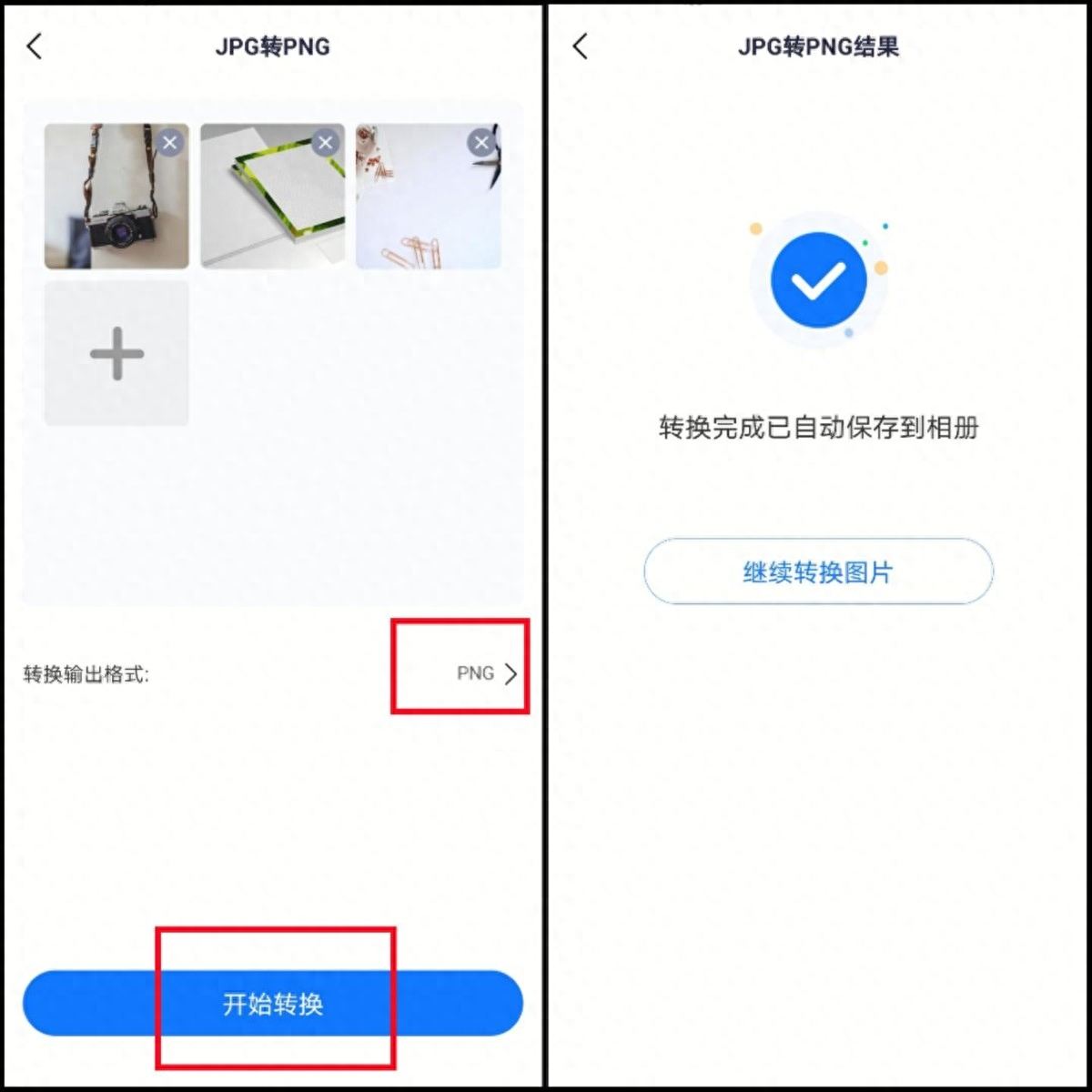 ② 导入进来的照片我们可以直接点击【开始转换】,照片就会转换成PNG格式并自动保存到相册中去啦,想要继续转换的话可以点击【继续转换图片】。