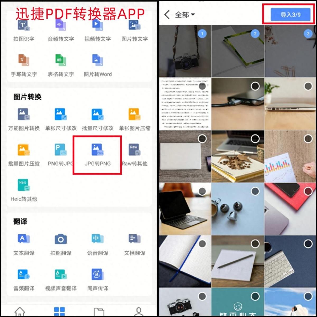① 首先,在手机上打开软件,在页面中就直接有【JPG转PNG】功能选项,进入后将照片选中点击【导入】。