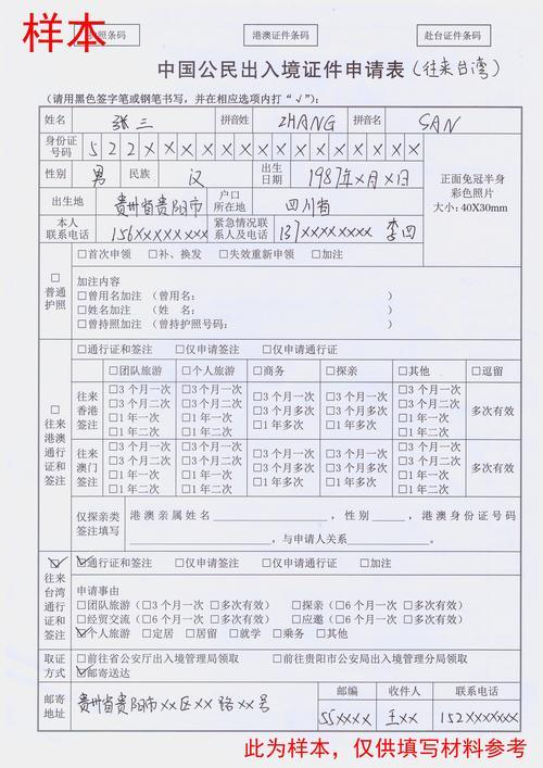 往来台湾证件申请表样式