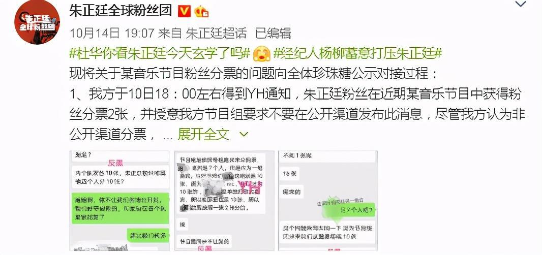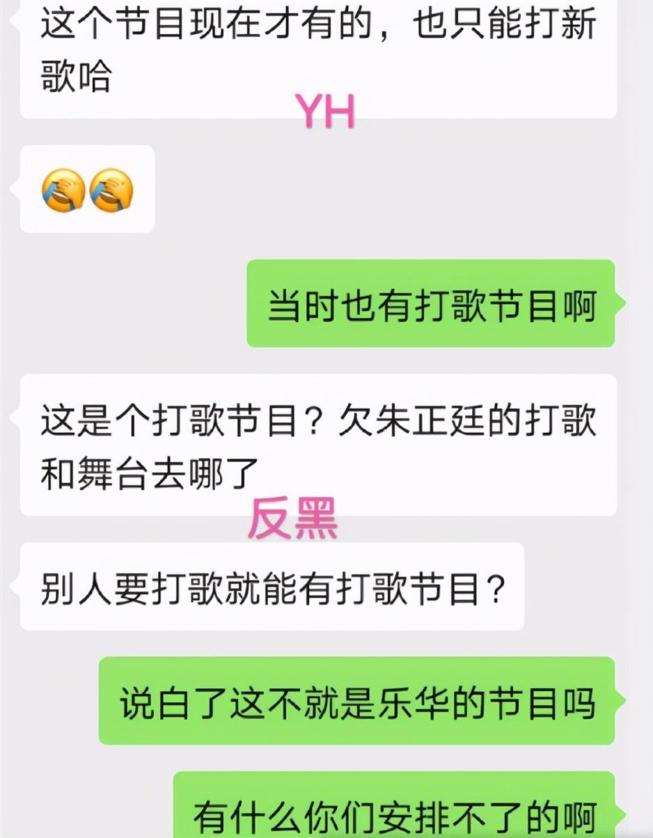 除此之外,还有粉丝表示朱正廷没有个人打歌舞台。在某张聊天记录中,有粉丝质问乐华的工作人员为什么朱正廷没有单独表演,而工作人员则表示“这是个打歌节目”。在此之后粉丝还表示这就是乐华的节目,并且质问工作人员为什么安排不了。而乐华的工作人员则直言自己只能按照节目组传达的内容给到大家。