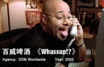 百威广告最具标志性的“whassup”口号,令人印象深刻。这则广告是根据名为《真实》的短片改编而成,讲述了朋友们之间独特的问候方式。广告的主角是非裔美国人,他们一边喝酒、看电视橄榄球赛,一边通过电话互相重复这句话。百威后来还出了新的故事情节,一个男人在寿司店把“wassabi”念的像“Whassup”。后来还将受众引导到Budweiser.com,他们在此可以学习如何用30多种语言说“Whassup”。一个伪装成狗的外星人被带到了一艘宇宙飞船上,并问他对地球有什么了解,他的回答也是“Whassup”。