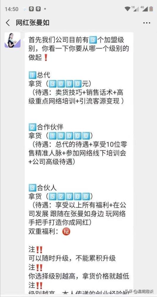 其实常人看来,这种模式就是传统的微商模式,一层层进货,想要拿货便宜,就得多交钱,成为总代,所谓的投入越多,收入越高。如果是质量好的化妆品,投入多倒也无可厚非。